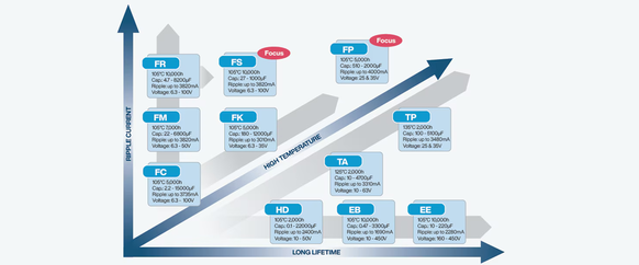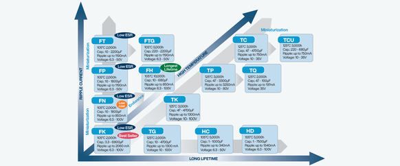 - · FT Series/ FP Series: ESR values down to 60 mΩ in compact packages.