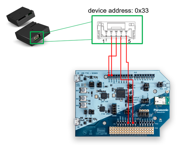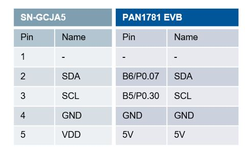 Basically, the sensor can be read out via UART interface or I2C bus. In this example, we want to read out the sensor via I2C, because this bus is suitable for the connection of several sensors. The JST-SM05B-GHS-TB(LF)(SN) acts as a connector for the sensor to contact the pins. The pinning of the sensor and the PAN1781 board is illustrated in this table: