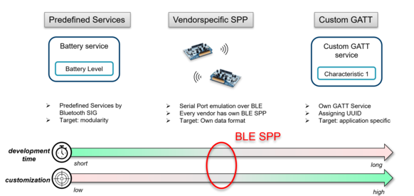 This matter is addressed by the Serial Port Profile (SPP) which is ultimately just a serial port emulation (UART) over Bluetooth®. The SPP profile played a big role in Bluetooth® Classic (i.e., before 4.2), but there is no standardized SPP profile defined by the Bluetooth® special interest group for Bluetooth® Low Energy. That’s why every chip vendor comes with their own Bluetooth® Low Energy Serial Port Profile which is merely a custom GATT service. This SPP approach fits well in the sweet spot for a balance between very customizable applications with limited functionality that need to be developed in a short time without diving deeper into the Bluetooth® Low Energy concept. In the end, the major workload will be on the application side to actually decode the sent string. But we’ll come to that later.
