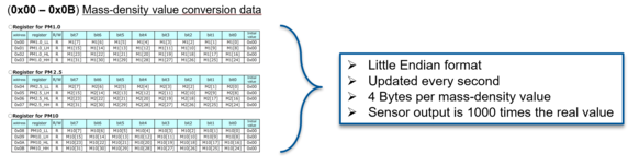 For every particle density, the actual value is spread across 4 consecutive byte registers in little-endian format, which means the lowest byte or better say Least Significant Byte is placed in the lowest address. This is important to know because when reading out the values one by one, from top to bottom, we have to assemble the bytes in the correct order. This is done by shift operations in the code later. And when we assemble the bytes correctly, we have to divide it by 1,000 since the output values are 1,000 times the real value. This is based on the high precision of the sensor to calculate the particle density to three decimal places.