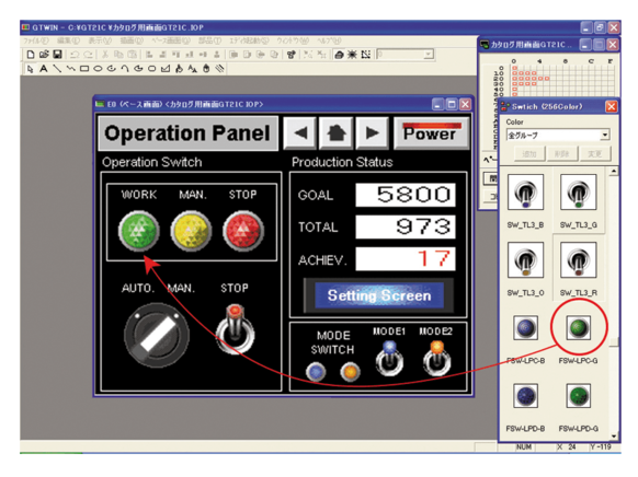 Mit dem Programm GTWIN lassen sich Bildschirminhalte gestalten und auf ein GT-Touch-Terminal übertragen. Es können auch umgekehrt Inhalte vom GT-Touch-Terminal heruntergeladen oder gedruckt werden. Sie können Bildschirmmeldungen oder Grafiken erzeugen. In GTWIN sind bereits viele vordefinierte Objekte enthalten, mit deren Hilfe Sie die einzelnen Bildschirmseiten schnell und einfach gestalten können, darunter Schalter, Lampen, Zeit-Objekte, Tastenblöcke etc. Ziehen Sie diese Elemente einfach auf die Bildschirmseite.