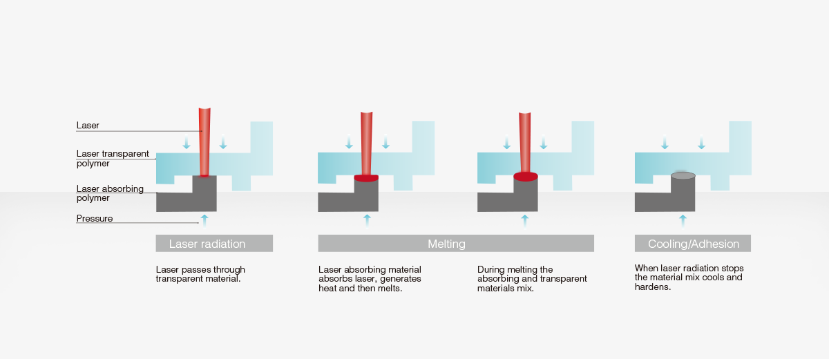 Welche Kunststoffmaterialen können mit dem VL-W1 von Panasonic verschweißt werden? Die Materialen können aus Elastomeren, teilkristallinen und amorphen Kunststoffen bestehen. Grundlegend sollte das Bauteil aus einem transparenten und einem absorbierenden Material bestehen. Der Laserstrahl durchdringt das lasertransparente (obere) Material und wird dann vom laserabsorbierenden (unteren) Material absorbiert. Somit erwärmt sich das laserundurchlässige Material und verschmilzt durch Wärmeübertragung mit dem lasertransparenten Material. Während des Schweißprozesses unterstützt ein an das Bauteil angepasster Fügedruck die exakte Verbindung der Kunststoffkomponenten.