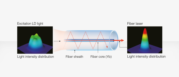 Dank des einzigartigen Oszillationsprinzips des Panasonic Faserlasers kann der Lichtleiter als Verstärker verwendet werden. Da sich Licht in einem extrem dünnen Faserkern exzellent verstärken lässt, kann so ein Laserlicht hoher Qualität erzeugt werden. Somit ist weniger Energieaufwand nötig und ein stabiler Strahl ist sofort ab der ersten Bearbeitung bis zum Ende der Produktion sichergestellt.