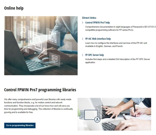 InfoHub proporciona información y documentación detallada del software de programación compatible con IEC 61131-3, para PLCs de la serie FP de Panasonic, soporte de configuración de interfaces y servicios para la unidad de comunicación FP-I4C, e instrucciones y descripciones del software FP OPC server.