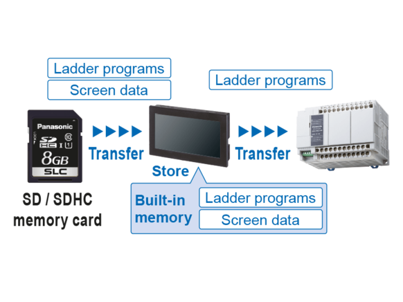 Los datos de proyecto de PLC y GTWIN puede transferirse fácilmente a través de la tarjeta SD/SDHC: Tan solo debe cargarlos desde el PLC o la pantalla táctil GT y volver a cargarlos.