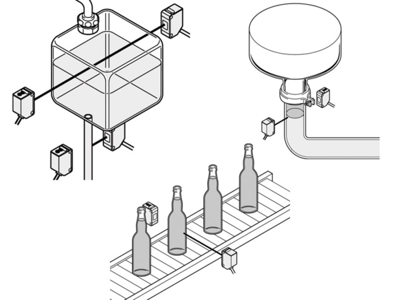 Ces capteurs barrage spéciaux permettent de détecter le remplissage ou le niveau de liquides aqueux. Le rayon infrarouge particulièrement puissant de l’émetteur traverse aussi bien les récipients transparents ou semi-transparents que les récipients colorés comme, par exemple, les bouteilles de shampoing. La sensibilité du capteur est réglable, ce qui permet, par exemple, de distinguer la mousse du liquide.