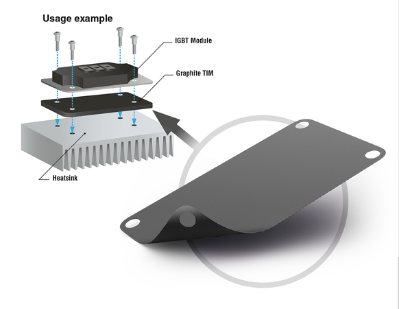 GraphiteTIM, a Panasonic exclusive material using highly crystallized graphite, transfers heat generated from a power device to a heat sink with excellent thermal conductivity. In addition, the high compressibility effectively fills the voids between the heating and the cooling device to achieve even lower low thermal resistance. Compared to grease, GraphiteTIM has a stable heat dissipation for a long period of time due to no deterioration and pump out effect.