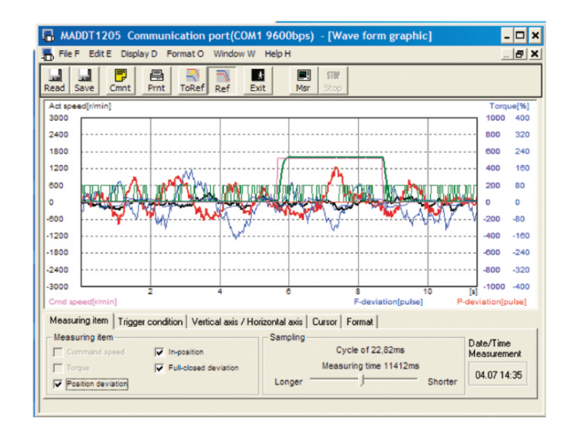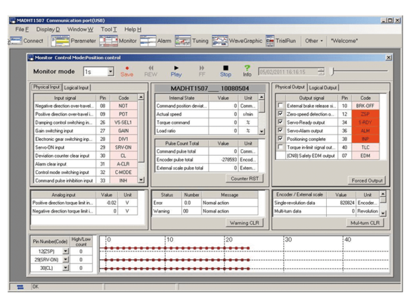 Parameters and status can be monitored, e.g. operation mode, speed, torque, error and warning. overview of command/feedback pulses, load ratio, regenerative resistive load ratio and many more.