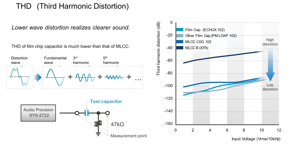 The higher precision, better stability and lower distortion of Panasonic's chip type film capacitors contribute to producing a good sound.