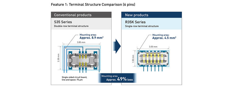 Downsizing while increasing performance at the same time is a key success factor for wearables, hearables and other smart devices. Compared to conventional connectors wit a double row structure, R35K series offers a space saving single row structure that enables wiring from one side. This saves up to 49% space and simplifies the routing on the PCB.