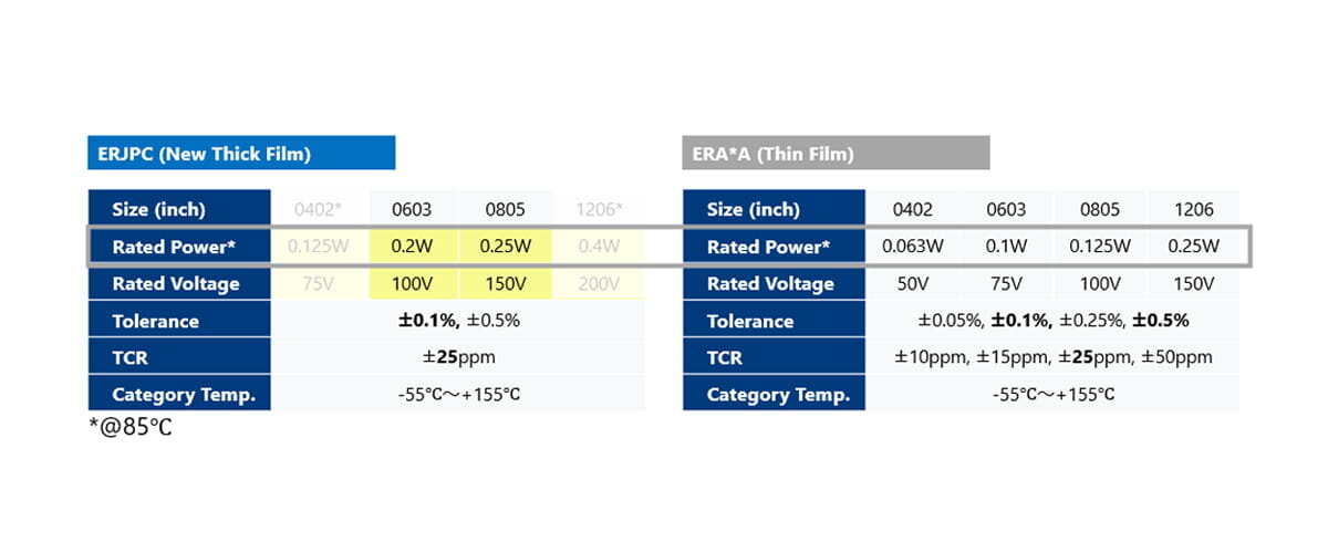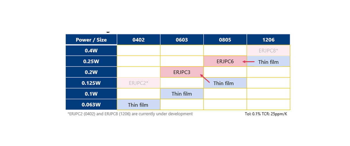Compared with thin film resistors of the same size, the new ERJPC High Precision Thick Film Chip Resistor (ERJPC) provide higher power capability, allowing the same power rating to be achieved in a smaller case size. ERJPC series enables up to 50% PCB space saving, supporting overall board miniaturization.