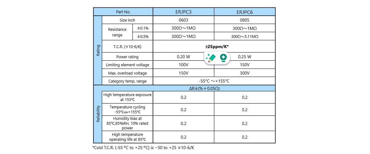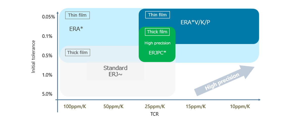 The ERJPC High Precision Thick Film Chip Resistor achieves resistance tolerance (±0.1%) and temperature coefficient of resistance (±25 ppm/K) equivalent to thin-film resistors, while maintaining thick-film construction through proprietary materials and process design.