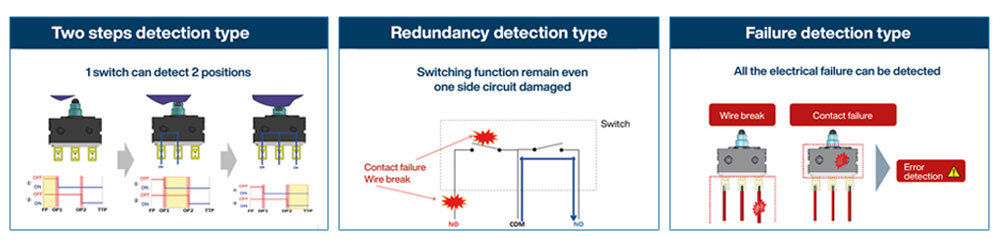 - Multi-function switch with our original 2 circuit structure: Two-step detection I Redundancy detection I Failure detection