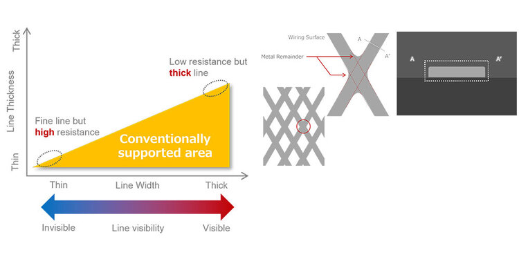 ITO (Indium Tin Oxide) typically has a resistance of tens to hundreds of ohms per square. ITO must be applied in thicker layers to meet the increasing demand for lower resistance in recent years. However, this thickness can reduce transmissivity and color changes, such as yellowing. To address these challenges, there is a push for developing and using alternative materials to ITO. One such alternative is the metal mesh, which Panasonic has developed.