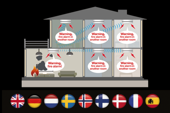 With Panasonic‘s product, when one smoke alarm goes off, then all the other alarms will also go off with different voice messages to warn all the residents about fire. Simply install a smoke alarm in each room and pair each device with the master smoke alarm in one of nine languages.