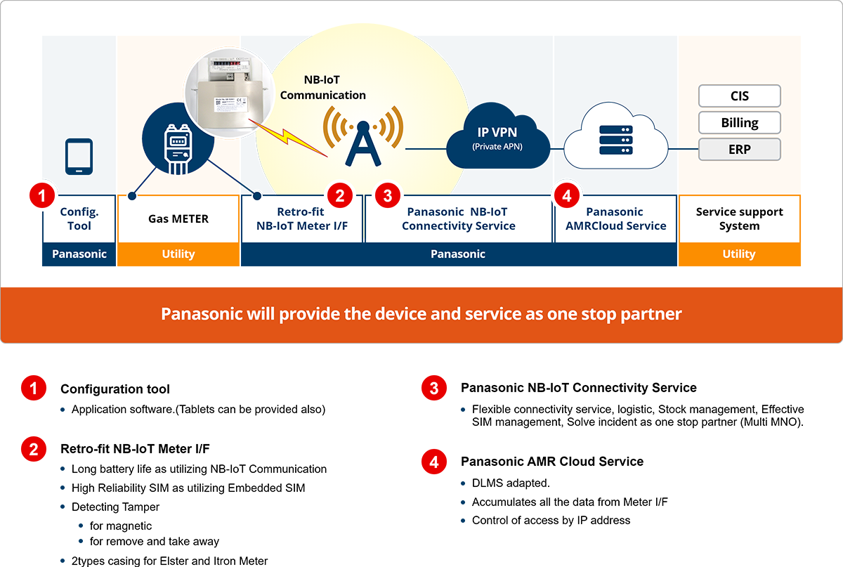 Panasonic offers not only devices for smart gas meters, but also services. We propose "Solution Service" to gas utilities.